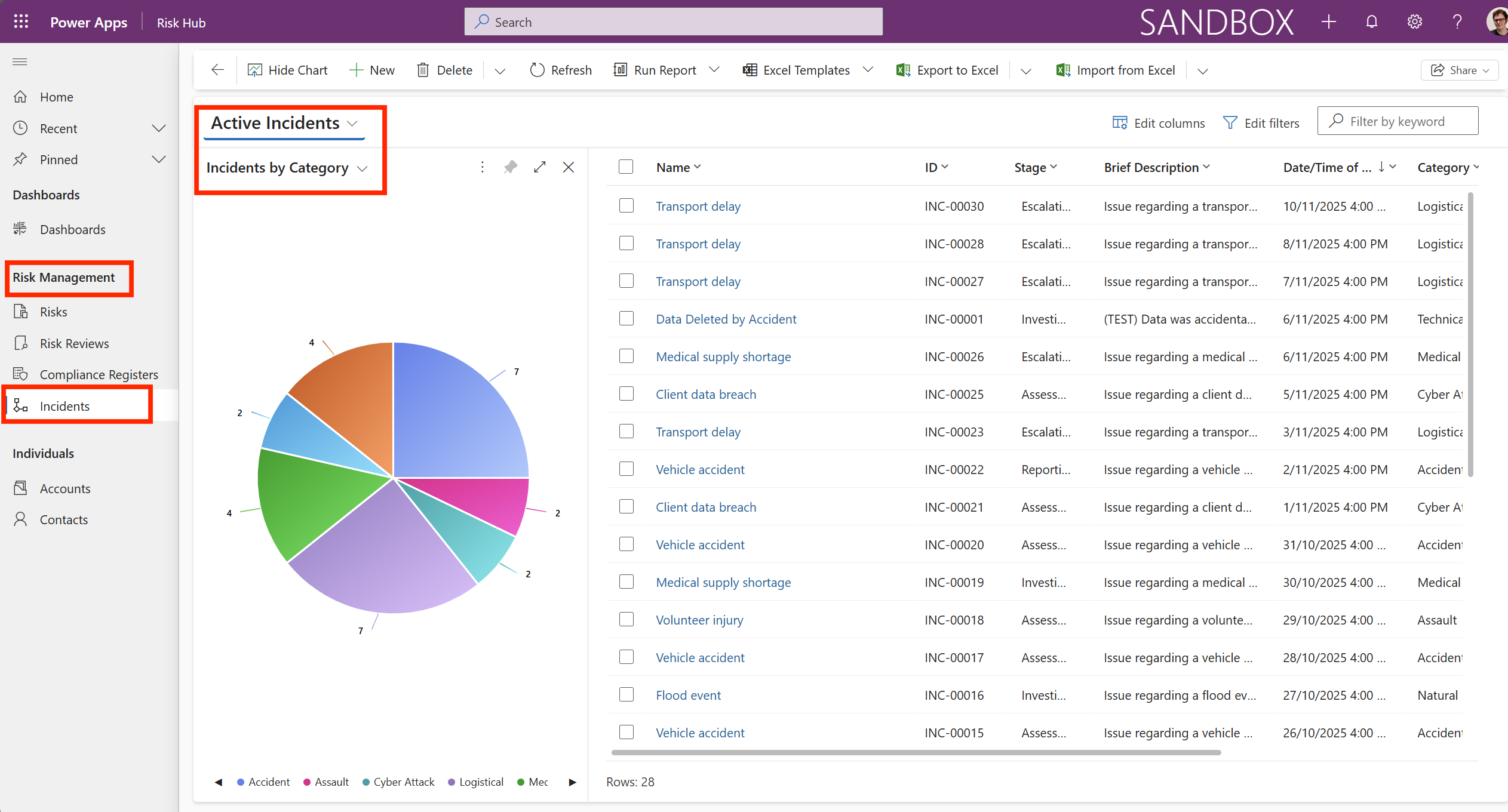 This is the Incidents view under Risk Management in the main menu. You will see the category chart showing Active Incidents and Incidents by Category.