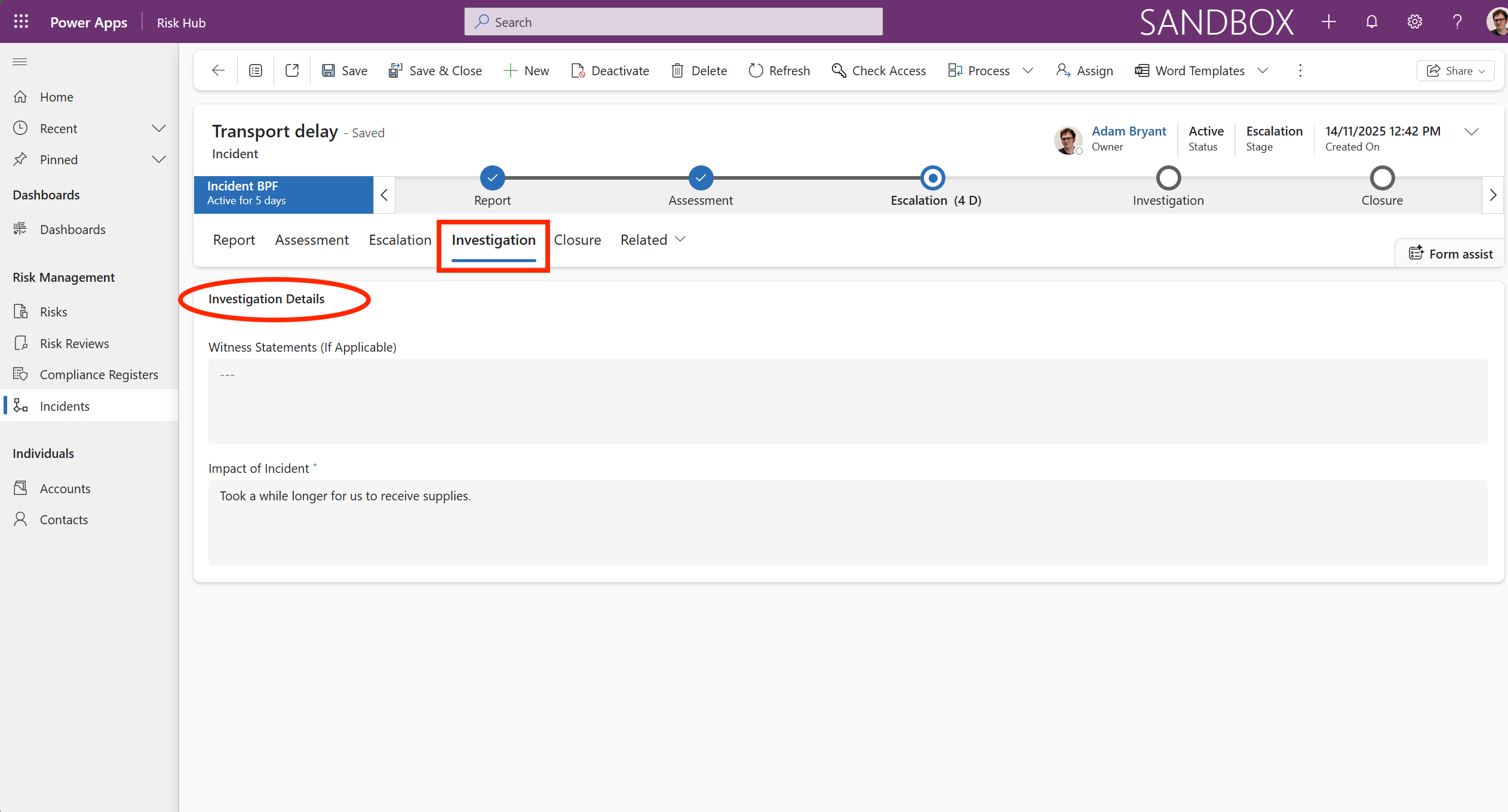 The Investigation tab records information about the incident in the Investigation Details section. This tab is typically dedicated to the process of thoroughly examining a risky event or incident that has occurred, or a significant finding from a control assessment. This function often integrates the risk management module with an Incident Management or Case Management module, allowing the risk team to formally analyze what went wrong, rather than just planning for what could go wrong.