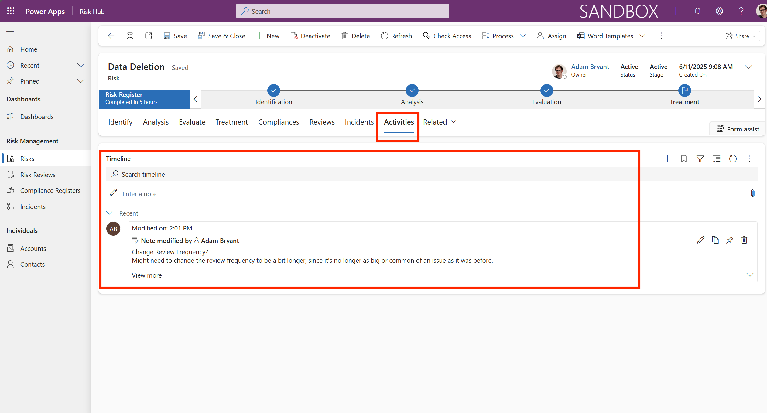 The Activities tab shows a trackable timeline. It serves as the central hub for managing all tasks, follow-ups, and documentation related to the risk record. It links the risk management framework directly to the standard productivity tools within the Dynamics 365/Power Apps platform.