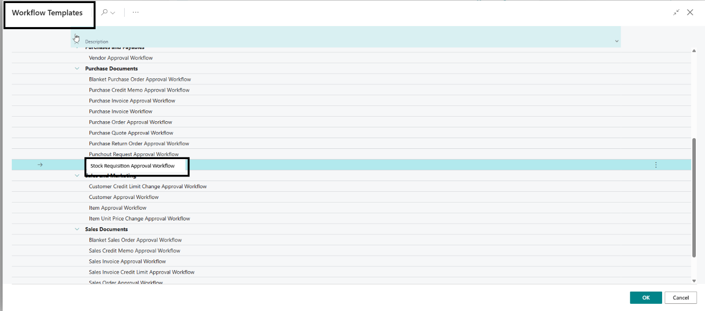 - We can see Stock Requisition Workflow from the workflow templates and configure as per approval user policies. We use the standard Business Central workflow.