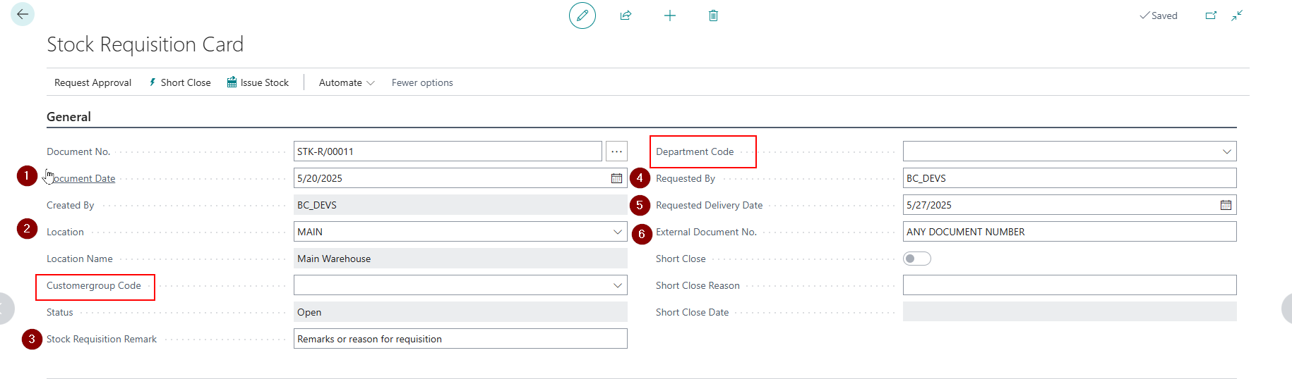 | 1 | Stock Requisition No | This is the auto-generated number series. |