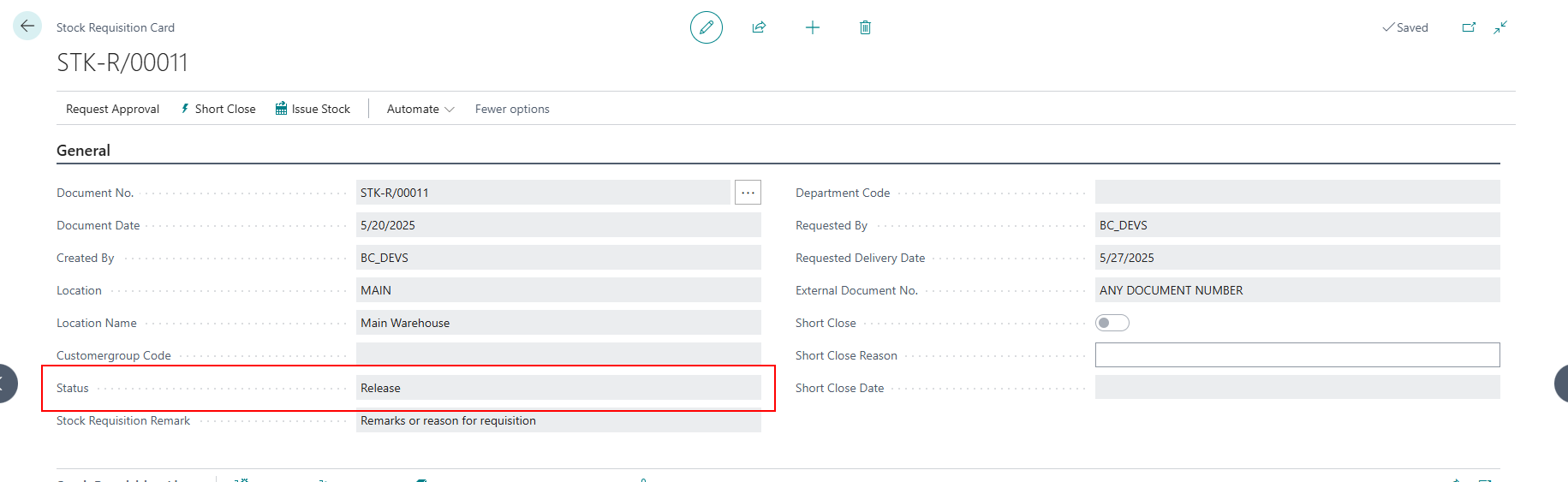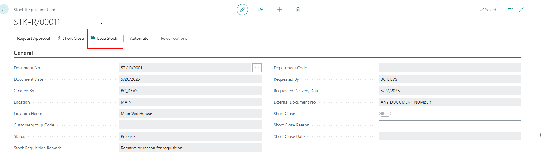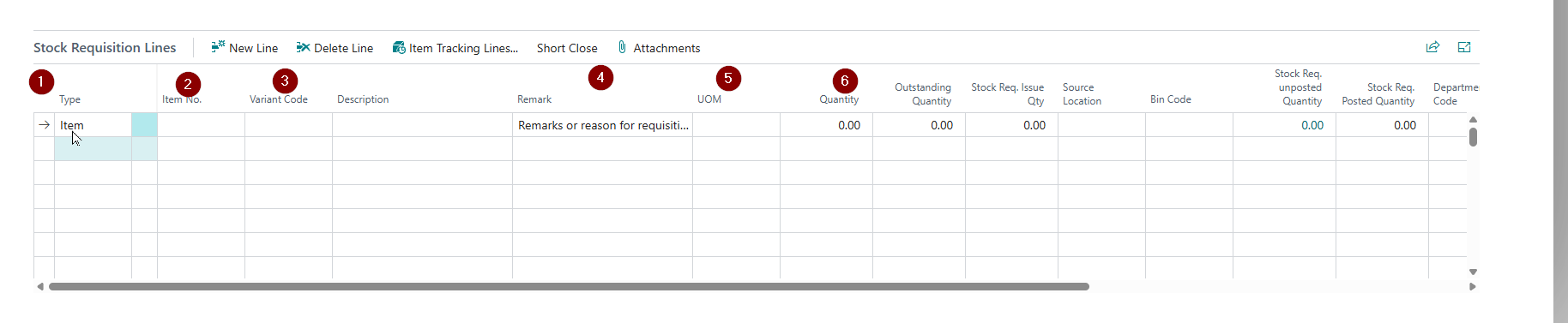 | 4 | Stock Requisition Remark | Comments or remarks from the header come automatically onto the line. |