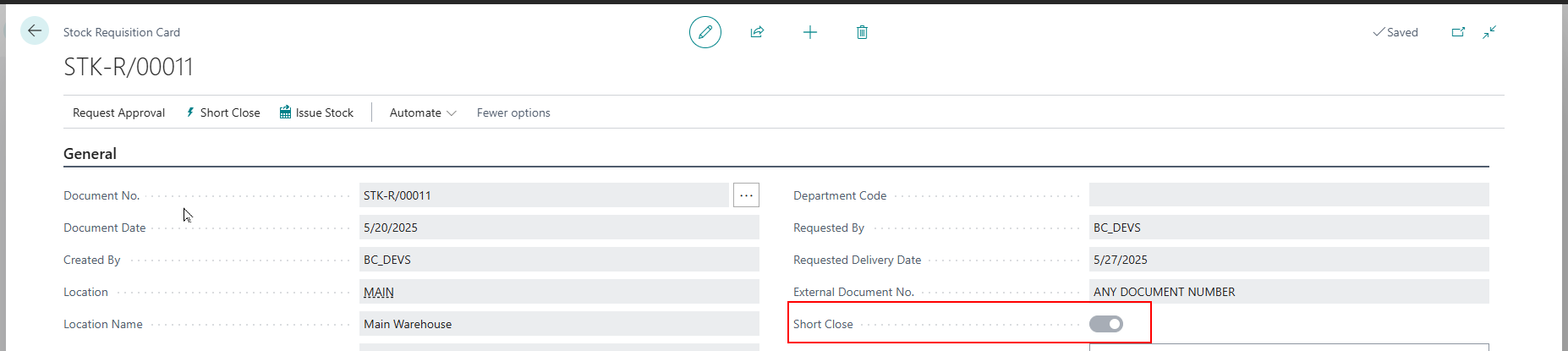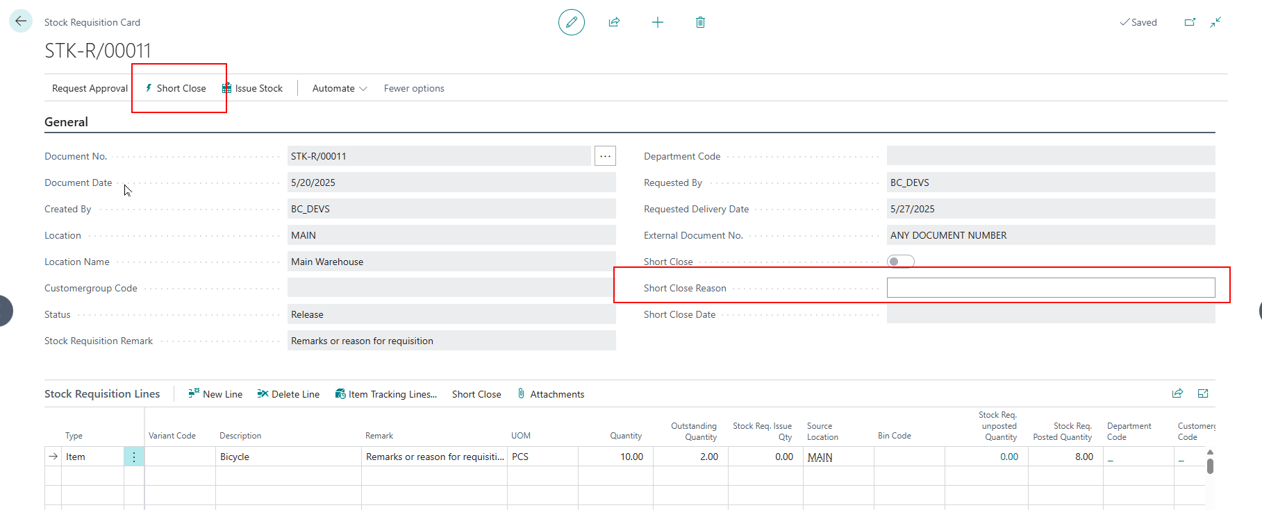 If the requisition is no longer required, or the remaining quantity is not to be issued, we can Short Close the requisition, by entering the remarks in Short Clkose Reason (which is mandatory).