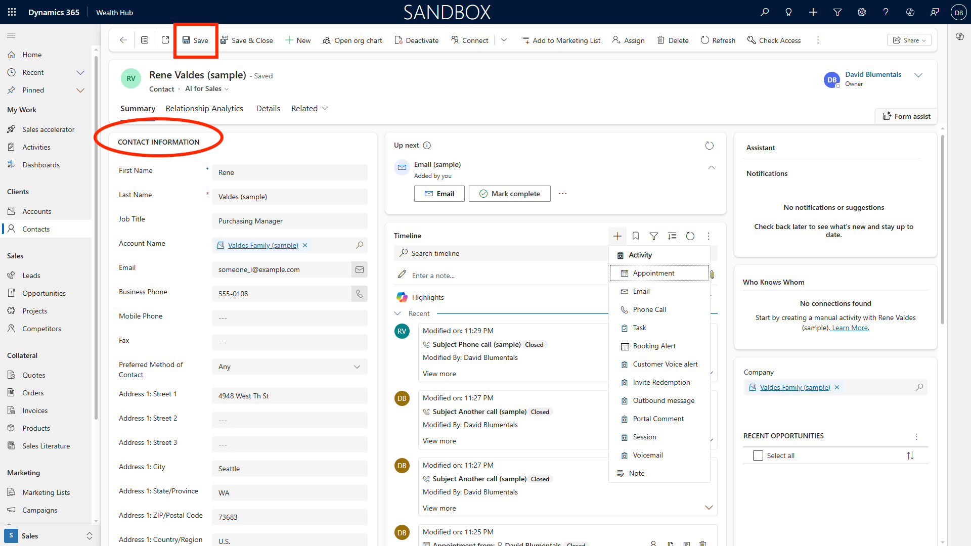 Save changes to establish the relationship, enabling visibility of all related activities and opportunities.