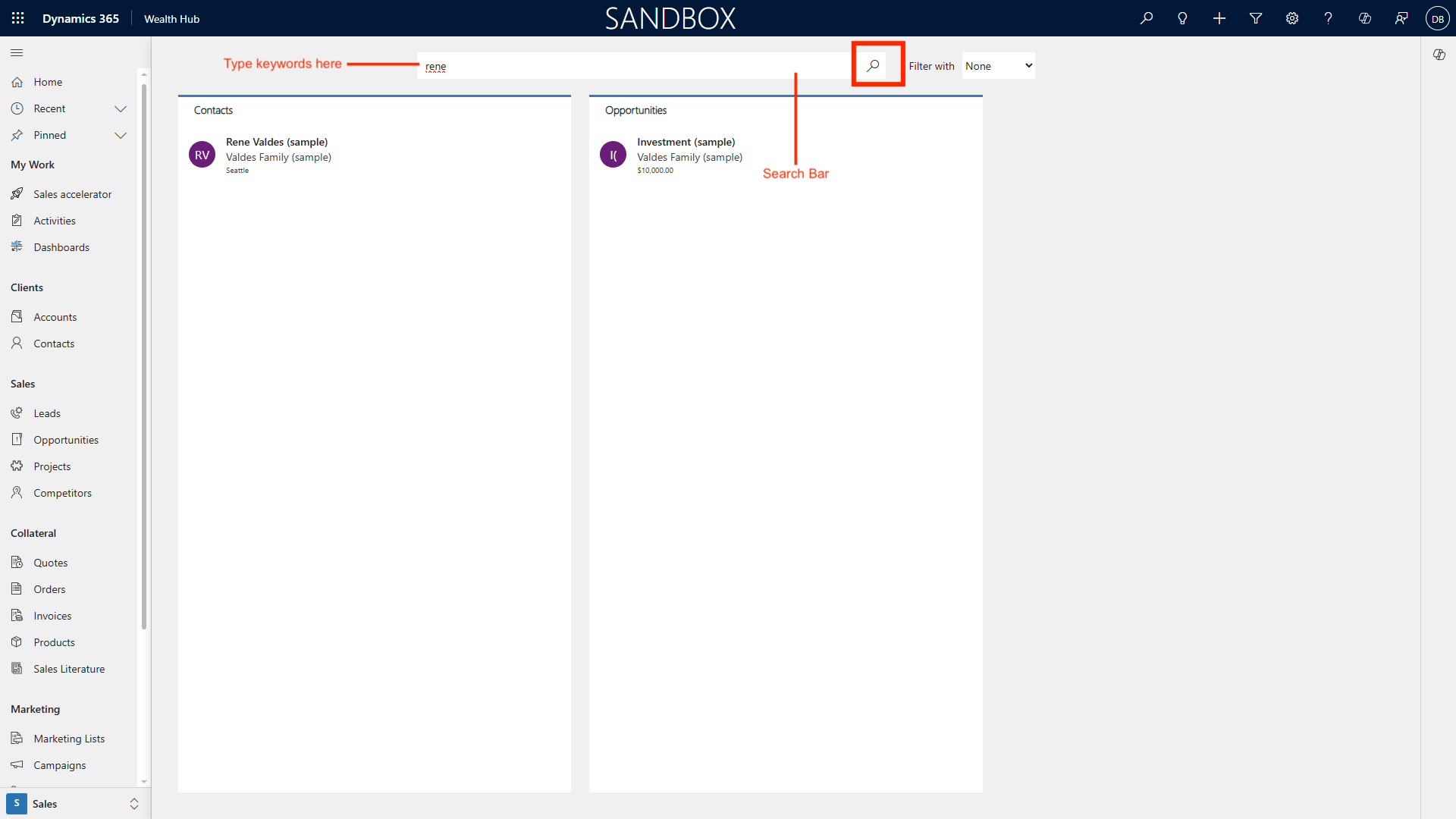 Enter keywords, names, or identifiers for opportunities, accounts, contacts, documents, or custom entities.